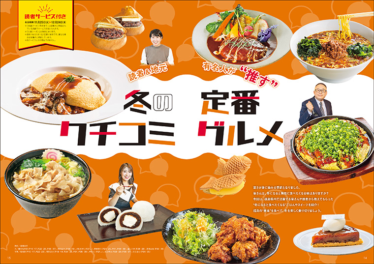 おしゃれな洋食、ホカホカのわっぱ飯、ボリューム満点の定食、ラーメン、うどん、季節限定のタルトタタン、鯛焼き…。新たな冬の定番がきっと見つかります。