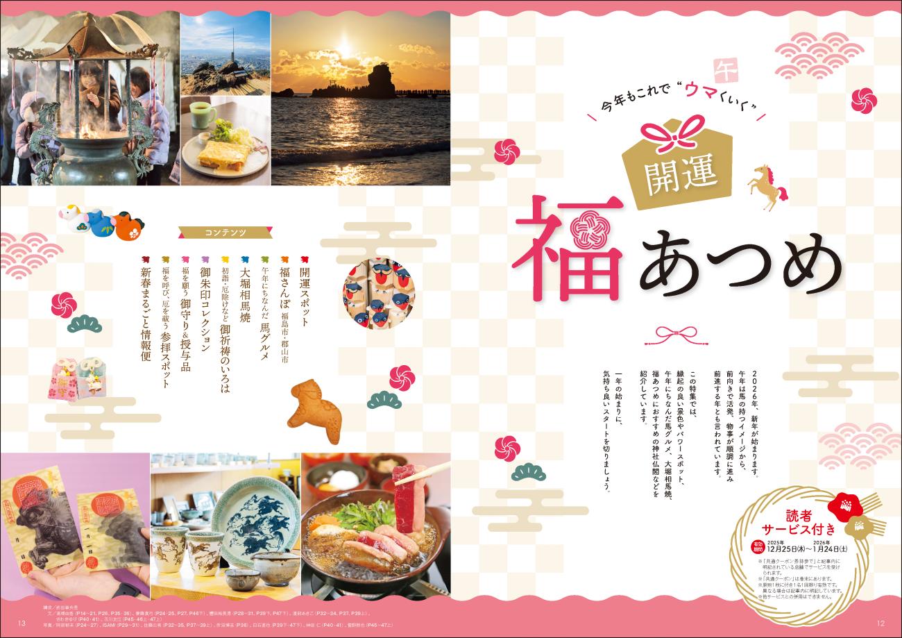 福島県のタウン情報誌「CJ Monmo」1月号の特集は、心と運気を整える開運スポットや、福島市・郡山市での「福」を探すまち歩きをご紹介。午年にちなんだ馬肉グルメ、いわき市で昔から愛される「うまかたようかん」など新年に味わいたいグルメも。